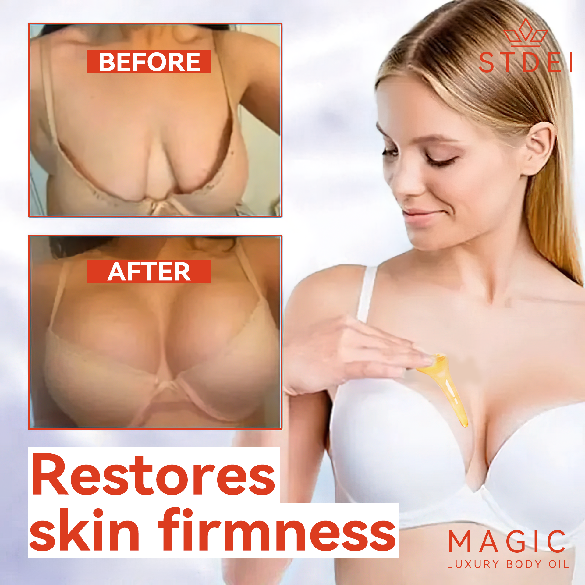 Wraz z wiekiem kolagen w skórze zmniejsza się, przez co skóra traci jędrność i elastyczność. Zmiany wagi mogą również negatywnie wpływać na jędrność skóry; szybki przyrost lub utrata wagi rozciąga skórę, niszcząc włókna elastyny i sprawiając, że wygląda ona starzej. Zgodnie z testami klinicznymi przeprowadzonymi przez Amerykańską Akademię Dermatologii, STDIE™ Magiczny luksusowy olejek do ciała może trwale rozwiązać te objawy w ciągu 3-5 dni. Ma ponad 180 000 zadowolonych użytkowników i liczba ta rośnie, przy czym 98,5% użytkowników zgłasza nasycenie.