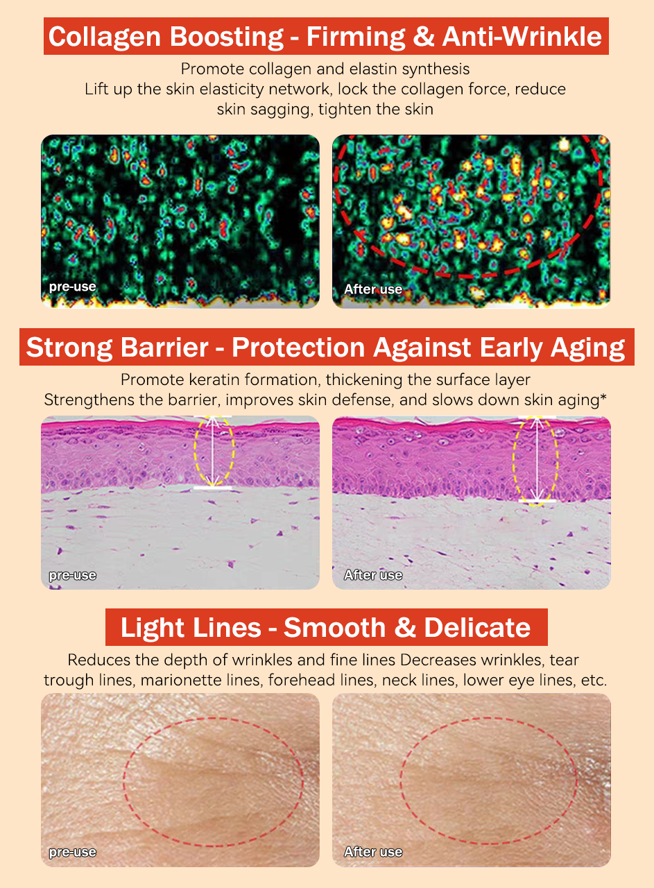 - Klinicznie udowodnione rezultaty: Redukuje drobne linie, zmarszczki, napina i ujędrnia skórę, zapewniając zauważalną poprawę.